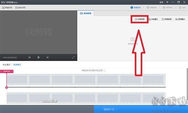 1、打開快剪輯軟件,在右上角找到“本地視頻”按鈕,點(diǎn)擊后選擇需要合并的視頻文件,一次性導(dǎo)入所有素材。