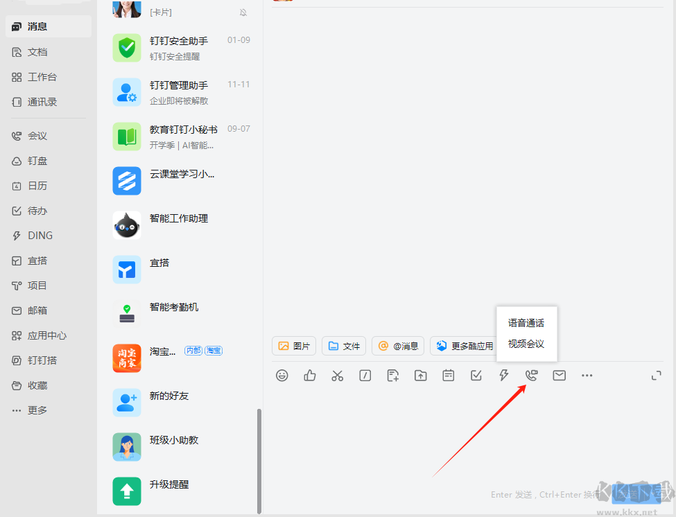 打開釘釘電腦版并登錄,點(diǎn)擊聊天輸入框上方的會(huì)議圖標(biāo),發(fā)起視頻會(huì)議。