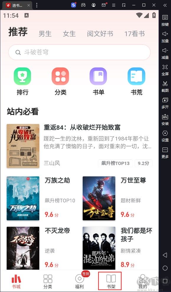 1、在本站下載追書神器電腦版后點(diǎn)擊書架;
