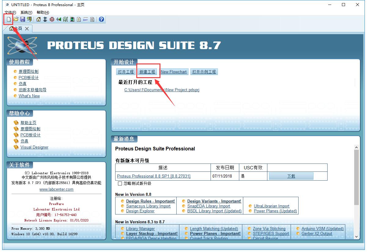 1、打開Proteus電路仿真軟件,點擊下圖所示兩個按鈕,新建工程;