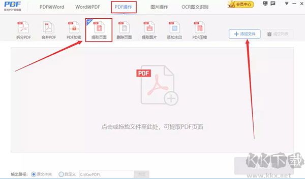 2、然后,我們切換至“PDF操作”的“提取頁面”界面,點(diǎn)擊右上方的“+添加文件”按鈕。