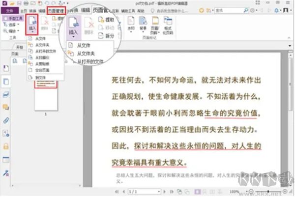 4、或者,你也可以點(diǎn)擊福昕高級(jí) PDF 編輯器菜單欄中的“頁(yè)面管理”,在其功能欄中點(diǎn)擊“插入”,再?gòu)?ldquo;插入”子菜單中選擇需要合并的 PDF 并進(jìn)行排列。