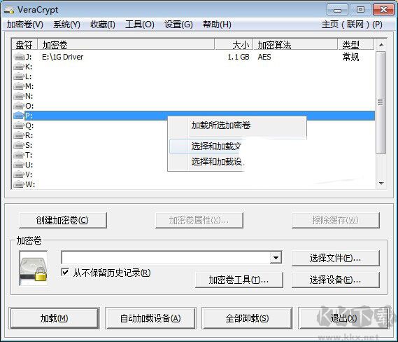1、運(yùn)行veracrypt,在主窗口的虛擬盤(pán)符上單擊,然后右鍵點(diǎn)擊“選擇和加載文件”菜單,這里我選擇P盤(pán)符,如下圖所示: