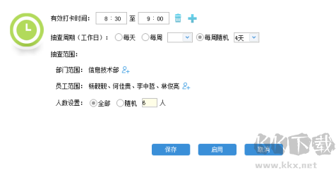 2、根據(jù)公司需要,設(shè)置有效打卡時間(被抽查員工打卡的有效時間)、抽查周期(每天、每周的某一天、每周隨機x天)、抽查范圍(添加某部門所有員工或單個員工)、人數(shù)設(shè)置(抽查范圍中的全部人或隨機x人),點擊“保存”并“啟用”,則該方案開始生效。