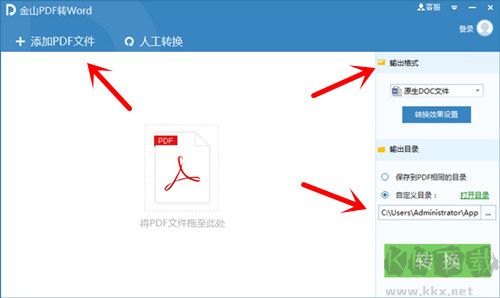 1、打開該軟件,進(jìn)入主界面。主界面左上方可點(diǎn)擊添加想要轉(zhuǎn)換的PDF文件,同時(shí)將PDF文件拖動(dòng)到中部的方法也可以實(shí)現(xiàn)。右上角設(shè)置轉(zhuǎn)換成的WORD格式,右下方設(shè)置保存轉(zhuǎn)換后文件的保存位置。