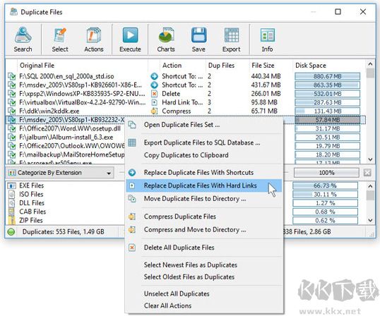 內(nèi)置的重復(fù)文件掃描功能非常強(qiáng)大,能在服務(wù)器、NAS 或企業(yè)存儲(chǔ)系統(tǒng)中精準(zhǔn)找出重復(fù)內(nèi)容。除了生成報(bào)告和圖表外,還能直接刪除冗余文件,或用硬鏈接替換,甚至壓縮后移動(dòng)到指定位置,節(jié)省存儲(chǔ)空間。