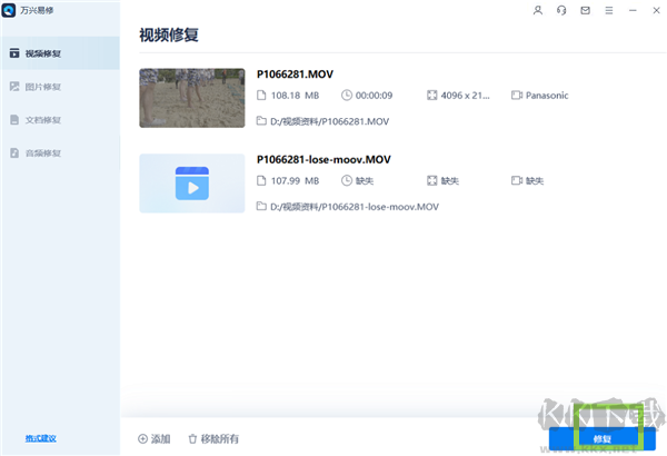 萬興易修是一款專業(yè)的破損文件修復工具,提供音視頻、照片、文檔等文件的修復,不管損壞的程度怎么樣,簡單三步就可以完成修復的操作。軟件還可以修復無法打開、播放報錯的視頻,支持持MOV、MP4、AVI、MTS、MKV等多種格式,不管是在拍攝的時候還是在傳輸?shù)臅r候破損的,都可以及時修復。需要的朋友快來下載試試吧!
