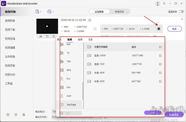 3、點(diǎn)擊右側(cè)設(shè)置按鈕可選擇你要轉(zhuǎn)換的格式以及分辨率