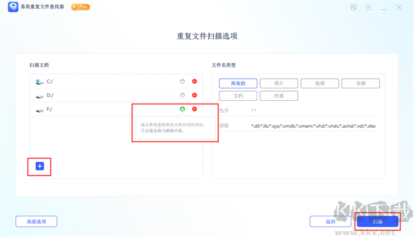 2)在重復(fù)文件掃描選項頁面中,點擊「+」按鈕可以選擇要掃描的文件夾或磁盤,點擊掃描文檔列表中右側(cè)「“鎖”」圖標(biāo),則表示該磁盤文件只做對比而不會被選作刪除對象,如果不想對掃描列表中某個磁盤或文件夾進(jìn)行掃描,點擊「Θ」按鈕去掉即可,在「文件名類型」中也可以根據(jù)自己的需求進(jìn)行選擇,完成后點擊「掃描」。