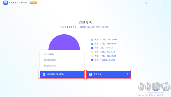 掃描完成后,會出現(xiàn)掃描完成界面,可直接點擊「自動移除」,會出現(xiàn)永久性刪除、移動到回收站、移動到文件夾三個選項,請根據(jù)自己的需求選擇;也可點擊「查看詳情」進(jìn)入「重復(fù)文件報告」頁面。