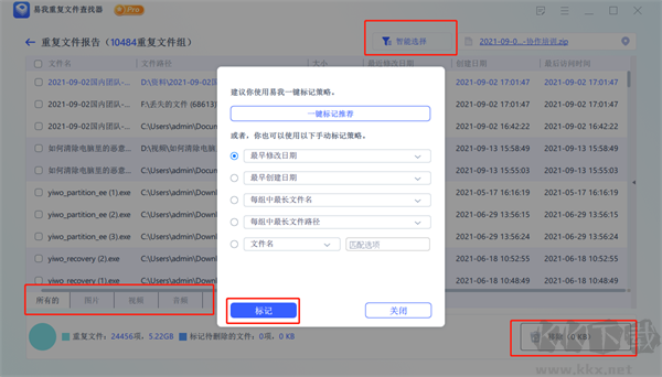 在「重復(fù)文件報告」頁面中,會顯示出所有重復(fù)文件,可根據(jù)文件類型更準(zhǔn)確選擇自己要刪除的文件,同時也能在「智能選擇」中使用「一鍵標(biāo)記策略」和「手動標(biāo)記策略」來確定刪除的文件,標(biāo)記后點擊右下角「移除」并選擇對應(yīng)選項。
