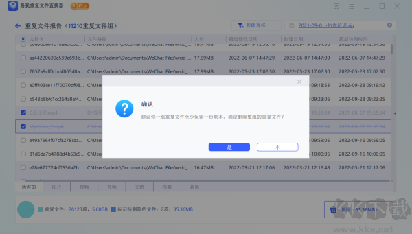 當(dāng)選擇一組所有的重復(fù)文件時,會出現(xiàn)“建議你一組重復(fù)文件至少保留一份副本。確定刪除整組的重復(fù)文件?”的提示。