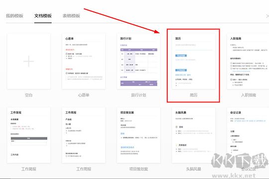 2、進入到模板選擇的界面,在上方的模板類型中選擇“文檔模板”,此模板下的“簡歷”模板就是我們今天所說的主角,對其進行點擊即可,如下圖所示: