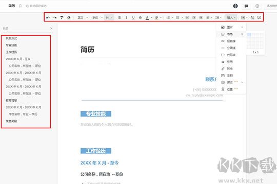 3、可以看到簡歷模板已經(jīng)成功建立了,簡歷最終的目的是要完成應聘,所以大家在填寫的時候,需要注意不能出現(xiàn)漏寫的情況,最好是從上到下依次填寫,簡歷的第一步就是要填寫你的職位或將要申請的職位,之后在右下方輸入聯(lián)系方式;而左邊紅框標注內(nèi)的目錄,就能夠幫助大家更好的填寫簡歷,大家還可以在上方的功能欄修改字體格式、顏色、大小與整體的排序,根據(jù)自己的需要是否添加圖片、表格、附件等內(nèi)容,至于簡歷中其他的工作經(jīng)歷、專業(yè)技能等內(nèi)容,小編在這里也就不再贅述了,如下圖所示: