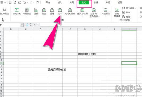 3、選中其它一個(gè)單元格,點(diǎn)擊公式、文本、菜單。