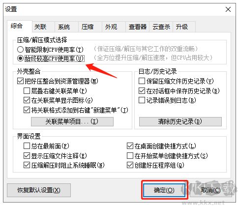 在壓縮解壓時(shí),點(diǎn)擊界面中的【智能限制CPU使用率】按鈕,切換為【始終最高CPU使用率】能夠一定程度上提高壓縮解壓速度,缺點(diǎn)是CPU使用率較高。