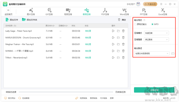 支持壓縮mp3,wav,ogg,flac,mp2,m4a,m4r等格式音頻,一鍵選擇壓縮電腦音樂、有效的節(jié)省電腦空間;導(dǎo)出格式可以選擇原格式壓縮,也可以統(tǒng)一轉(zhuǎn)成mp3格式。