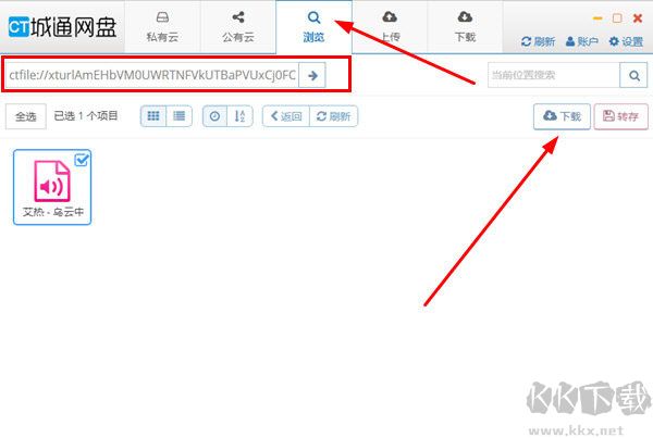 1、如果你想要在城通網盤中下載別人分享的文件,只需要復制鏈接,在“瀏覽”欄將鏈接粘貼到紅框標注的地方,用戶就可以在其中看到分享的文件,選擇你想要下載的文件,點擊右方的“下載”選項開始下載,如下圖所示: