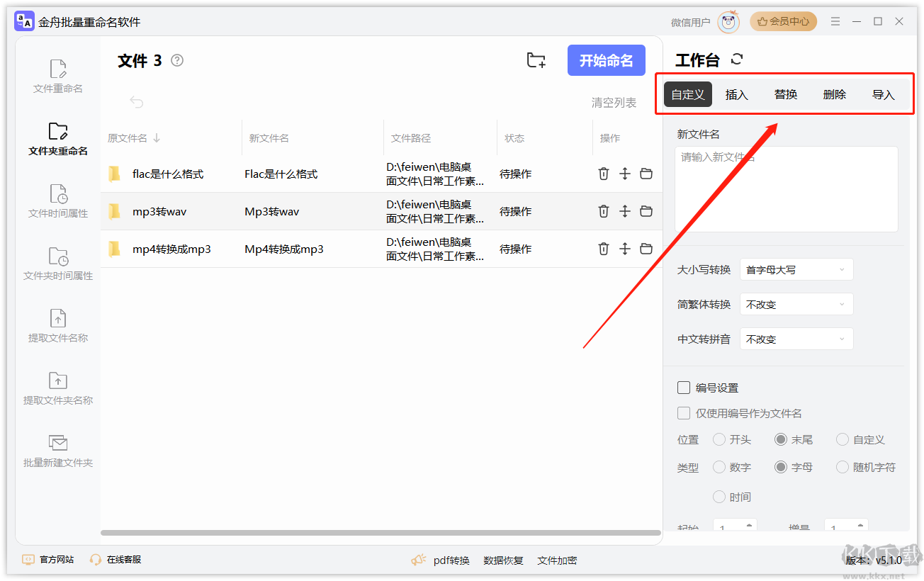 2、在右側工作臺中選擇命名方式:自定義、插入、替換、刪除、導入。