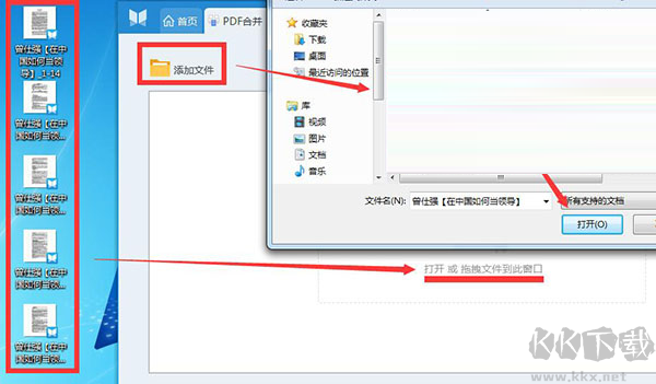②打開“PDF合并”界面,添加需要拆分的PDF文件。打開文件有兩種方法,把PDF文件拖入到閱讀器中或直接點擊左上方【添加文件】即可完成。