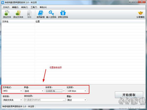 2、文件選擇完畢后,可對(duì)提取的音頻進(jìn)行設(shè)置,軟件支持文件格式設(shè)置、聲道設(shè)置、采樣率設(shè)置、比特率設(shè)置,如圖所示:
