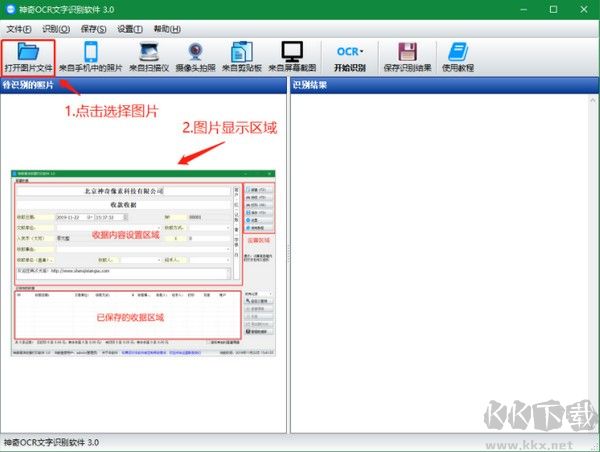 1、第一步:打開等待識(shí)別文字的圖片,支持圖片文件、來自手機(jī)中的圖片、來自掃描儀的圖片、攝像頭拍照、來自剪貼板的圖片、來自屏幕截圖,打開之后圖片會(huì)顯示在左側(cè)“圖片顯示區(qū)域”內(nèi)