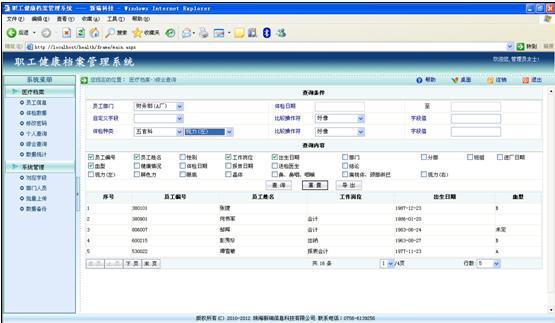 職工健康檔案管理系統(tǒng)是一款適用于公司企業(yè)使用的職工檔案管理軟件,內(nèi)置B/S架構(gòu)的網(wǎng)絡(luò)版系統(tǒng),后臺(tái)管理和前臺(tái)個(gè)人查詢都通過瀏覽器進(jìn)入訪問。通過這款職工管理系統(tǒng)主要可以管理職工健康狀況的記錄、歷次體檢結(jié)果的存儲(chǔ)、查詢、統(tǒng)計(jì)分析、EXCEL數(shù)據(jù)導(dǎo)出等功能。歡迎有需要的管理人員前來kkx獲取這款員工檔案管理系統(tǒng)