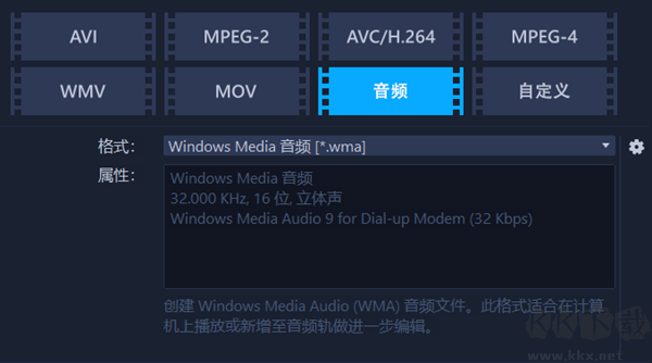 第三步,選擇了音頻文件格式后,下方的格式會(huì)切換為wma格式。如果想選擇其他音頻格式,可以點(diǎn)擊格式右側(cè)的下拉菜單,選擇wav、m4a等其他格式。