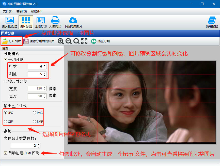 支持按行列數(shù)平均分割或按指定的尺寸分割兩種分割方式