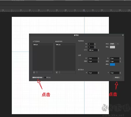 3、在彈出的窗口中,點(diǎn)擊“清除所有參考線”,并點(diǎn)擊“關(guān)閉”按鈕,即可完成參考線的清除。