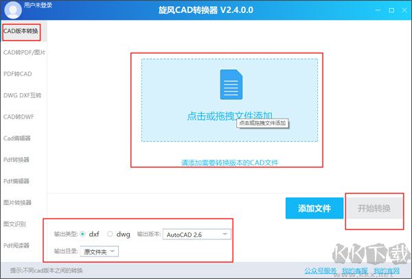 打開軟件之后,用鼠標(biāo)靠近“點擊或拖拽文件添加”,選擇好需要換貨版本的CAD文件。選擇好之后,設(shè)置左下方的輸出類型、輸出版本以及輸出目錄,最后點擊開始轉(zhuǎn)換。