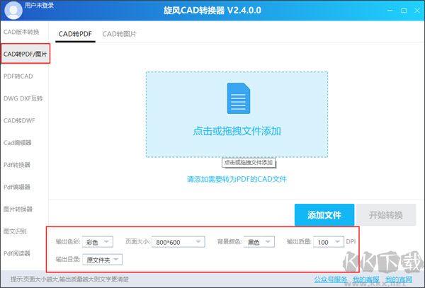 這個功能主要就是用來將CAD文件轉(zhuǎn)換成PDF或圖片格式,下面就是設(shè)置輸出色彩、頁面大小、背景顏色、輸出質(zhì)量等,同樣點擊開始轉(zhuǎn)換按鈕即可。