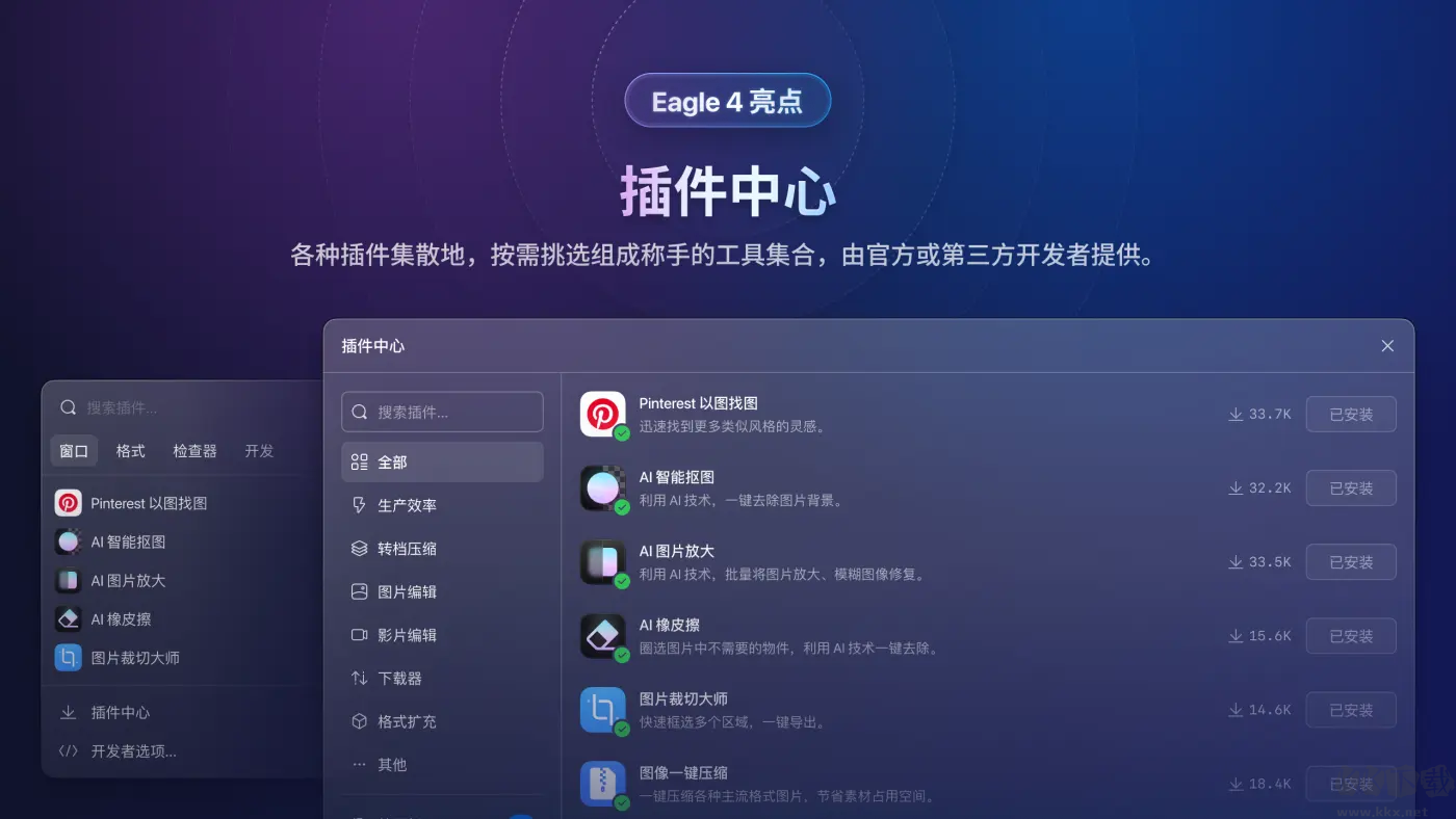 插件系統(tǒng) - 任何人都可以使用 Web 開(kāi)發(fā)技術(shù),為 Eagle 添加各種功能。