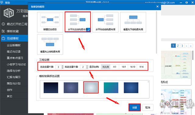 2、選擇你需要的結(jié)構(gòu)布局,設(shè)置上方和下方或者左邊和右邊的主題個數(shù),顯示比例和背景顏色,點擊“創(chuàng)建”即可