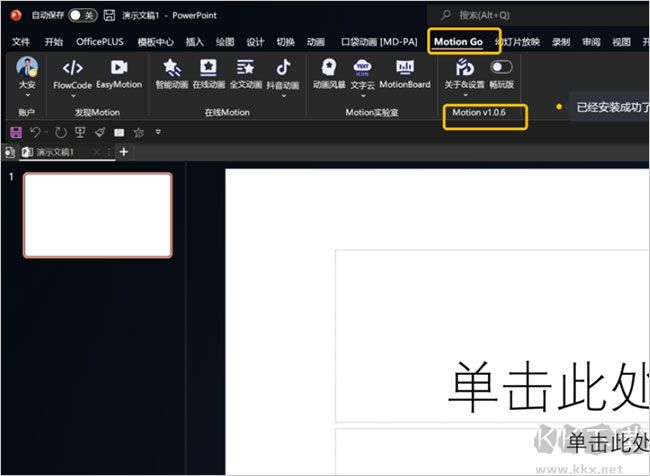安裝結(jié)束后,即可點(diǎn)擊“立即打開(kāi)”就會(huì)啟動(dòng)PPT程序,然后你在頂部選項(xiàng)卡就可以看到“MotionGo”了。