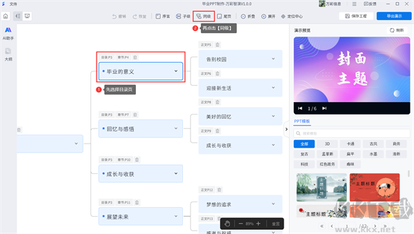 除了傳統(tǒng)的文本模式PPT,還支持以思維導(dǎo)圖的形式展現(xiàn)智能生成的PPT內(nèi)容,迅速關(guān)聯(lián)PPT的關(guān)鍵點(diǎn)和創(chuàng)意想法,快速構(gòu)建清晰的PPT思維導(dǎo)圖。這種方式比手動(dòng)制作更加高效,非常適合忙碌的職場(chǎng)人士使用。