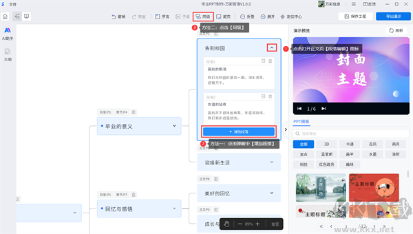 萬(wàn)彩智演是智能生成演示文稿的辦公軟件,以智能AI生成文本為輔助,能快速做出有炫酷3D演示效果的精美 PPT。支持文本模式和思維導(dǎo)圖模式可選,節(jié)省大量時(shí)間也使PPT內(nèi)容更完整有條理。萬(wàn)彩智演操作簡(jiǎn)單,用戶選擇與主題匹配的高質(zhì)量PPT模板,應(yīng)用后會(huì)根據(jù)內(nèi)容對(duì)每一頁(yè)排版布局,包括標(biāo)題設(shè)計(jì)、圖片、排版布局、動(dòng)畫效果設(shè)置等,不用一頁(yè)一頁(yè)操作。需要的朋友快來(lái)下載試試吧!