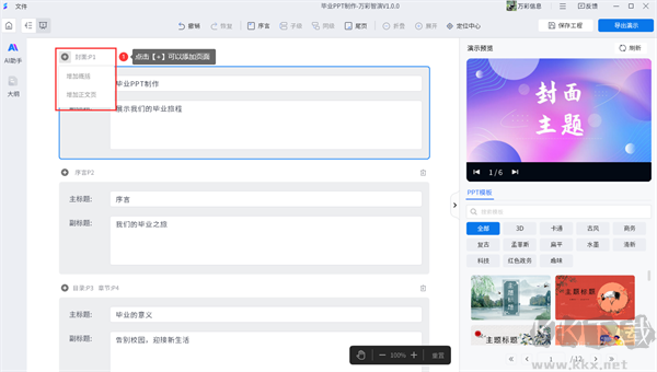集成萬(wàn)彩AI,只需提供核心內(nèi)容與關(guān)鍵詞,即可一鍵生成符合要求的完整PPT內(nèi)容。 • 利用AI技術(shù)簡(jiǎn)化PPT制作流程,大幅節(jié)省時(shí)間。