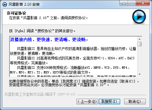 1.風(fēng)雷影音II下載后,打開exe安裝程序,點擊下一步繼續(xù)安裝;
