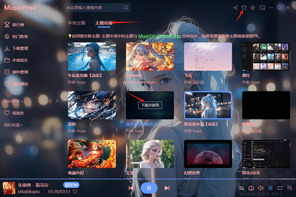 3、想要更改主題的話,需要先點(diǎn)擊右上角的小衣服在點(diǎn)擊主題市場(chǎng)看到自己喜歡的下載使用就好了,也可以下載下載主題包使用。