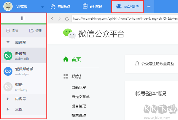 愛微幫電腦助手是一款針對微信開發(fā)的軟件,通過它用戶可以進(jìn)行微信多賬號登錄、管理多個公眾號、快速發(fā)表文章、自動推送信息等多項操作,幫助用戶進(jìn)行有效管理,非常適合從事微信媒體推廣的用戶。