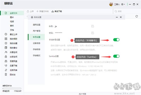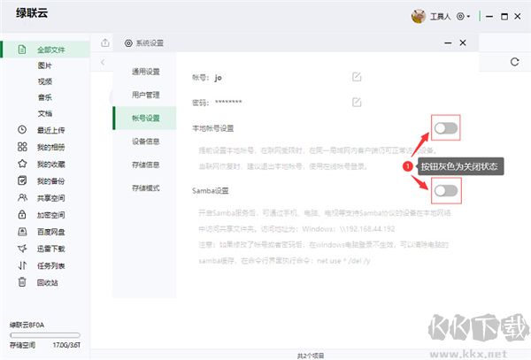 5、開啟「本地賬號」和「Samba」,按鈕綠色為開啟狀態(tài)。