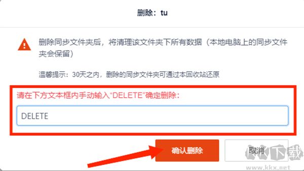 3、彈出刪除提示窗口,閱讀完相關(guān)說明后,在【文本框】輸入【DELETE】,選擇【確認刪除】即可刪除同步文件夾了。