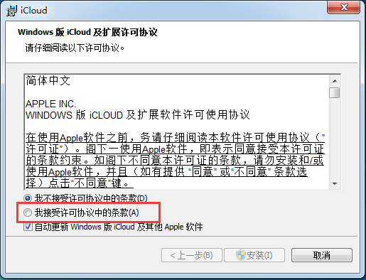 1.從kkx分享的地址獲取到安裝包,打開安裝程序,Windows版iCloud及擴(kuò)展許可協(xié)議