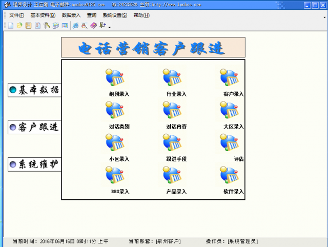電話(huà)營(yíng)銷(xiāo)客戶(hù)檔案客戶(hù)跟進(jìn)管理系統(tǒng)是一款適用于做電話(huà)營(yíng)銷(xiāo)用戶(hù)必備的客戶(hù)管理客戶(hù)跟進(jìn)軟件,讓你更輕松有效的進(jìn)行電話(huà)營(yíng)銷(xiāo)跟進(jìn)!