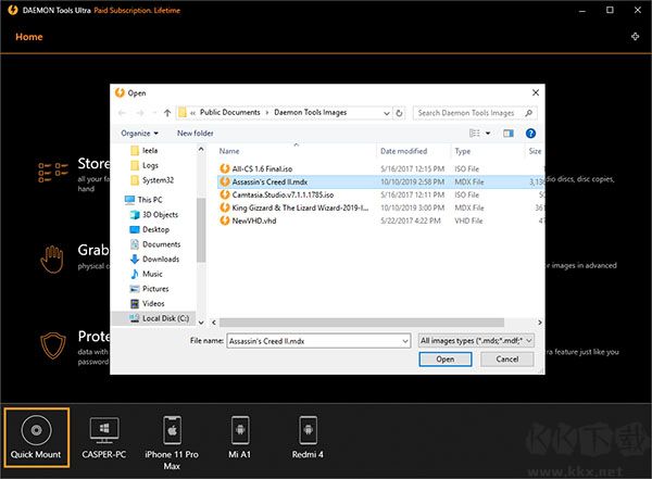 要在DAEMON Tools Ultra中掛載圖像,請(qǐng)單擊“快速掛載”按鈕,然后在對(duì)話(huà)框中選擇所需的圖像文件: