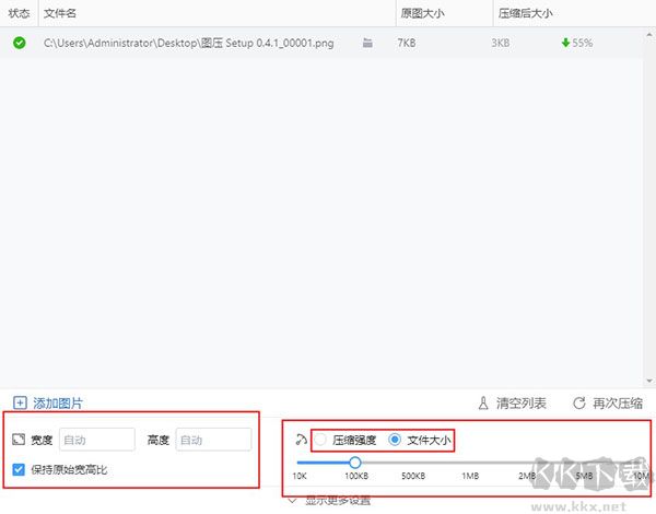 5、軟件下方區(qū)域可以對圖片壓縮后的長寬和壓縮強度、文件大小進行設置。