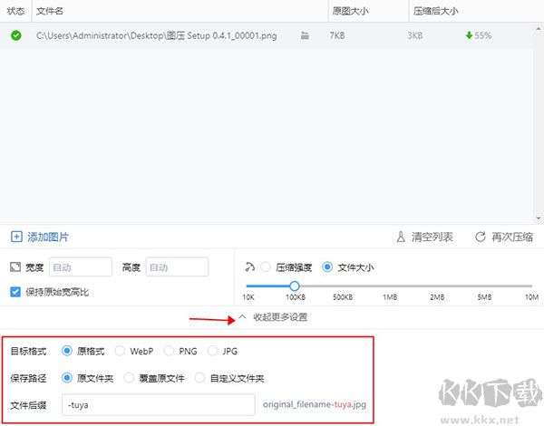 6、點擊顯示更多設置,還可以對目標格式、保存路徑和文件后綴進行設置,一般都不用去改的,默認就好。
