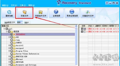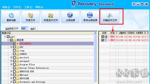 3、點(diǎn)擊“掃描丟失文件”按鈕,可對該磁盤文件進(jìn)行掃描,D-Recovery自動(dòng)將可恢復(fù)文件以列表的形式顯示在窗口中,如下圖所示:
