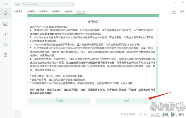 2、花費 20 秒時間瀏覽許可協(xié)議,點擊接受按鈕,就能順利進入這個音樂程序的操作頁面。